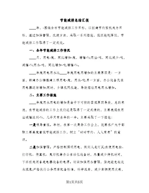 第2篇示例:节能减排工作总结一、节能减排的主要成果在过去一段时间内,我国在节能减排方面取得了一些显著的成果。