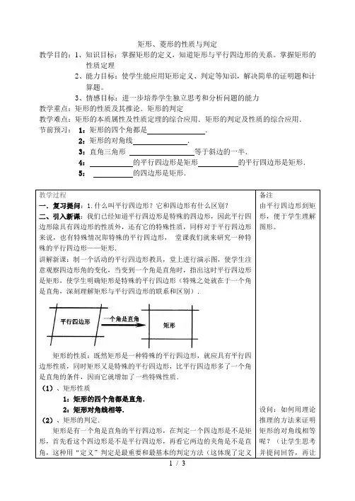 3、情感目标:进一步培养学生独立思考和分析问题的能力教学重点:矩形的性质及其推论.矩形的判定教学难点:矩形的本质属性及性质定理的综合应用.矩形的判定及性质的综合应用.节前预习: 1:矩形的四个角都是.2:矩形的对角线.3:直角三角形等于斜边的一半.4:的平行四边形是矩形的平行四边形是矩形.5:的四边形是矩形.教学过程一.复习提问:1.什么叫平行四边形?它和四边形有什么区别?二、引入新课:我们已经知道平行四边形是特殊的四边形,因此平行四边形除具有四边形的性质外,还有它的特殊性质,同样对于平行四边形来说,也有特殊情况即特殊的平行四边形,堂课我们就来研究一种特殊的平行四边形——矩形.讲解新课:制一个活动的平行四边形教具,堂上进行演示图,使学生注意观察四边形角的变化,当变到一个角是直角时,指出这时平行四边形是矩形,使学生明确矩形是特殊的平行四边形(特殊之处就在于一个角是直角,深刻理解矩形与平行四边形的联系和区别).矩形的性质:既然矩形是一种特殊的平行四边形,就应具有平行四边形性质,同时矩形又是特殊的平行四边形,比平行四边形多了一个角是直角的条件,因而它就增加了一些特殊性质.(1)、矩形性质1:矩形的四个角都是直角.2:矩形对角线相等.(2)、矩形的判定.矩形是有一个角是直角的平行四边形,在判定一个四边形是不是矩形,首先看这个四边形是不是平行四边形,再看它两边的夹角是不是直角,这种用“定义”判定是最重要和最基本的判定方法(这体现了定义备注由平行四边形到矩形,便于学生理解图形。
