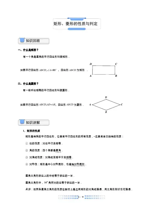 〖注意〗1.对角线互相垂直的四边形不一定是菱形,必须加上平行四边形这个条件它才是菱形.2.利用菱形的性质及判定可以证明线段相等及倍分、角相等及倍分、直线平行、垂直,以及证明一个四边形是菱形和有关计算.矩形性质1:矩形的四个角都是直角.2:矩形的对角线相等.3.直角三角形斜边上的中线等于斜边的一半.判定:1、有一个角是直角的平行四边形。