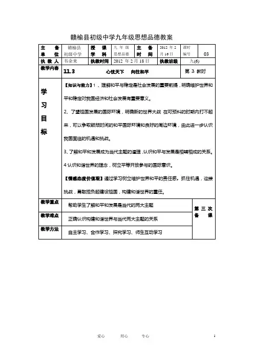 第11课 胸怀全球 迎接挑战心忧天下 向往和平一、教材分析:本课属于苏人版九年级第五单元第11课第三框题的教学内容。