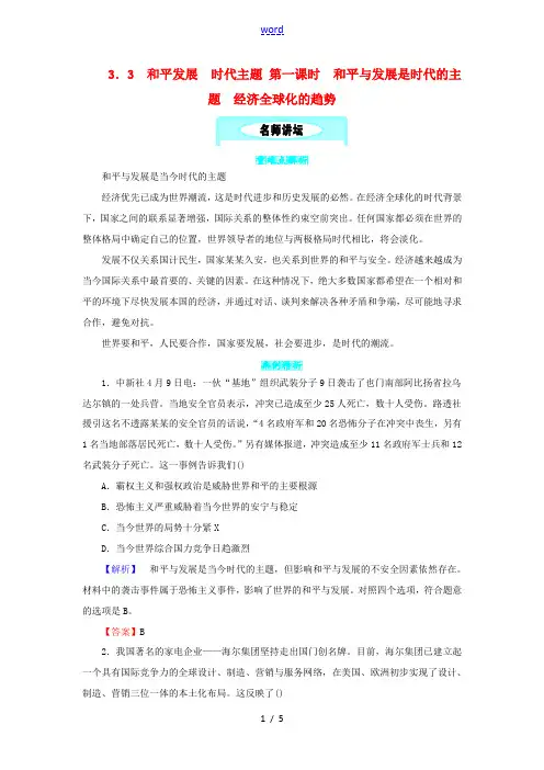 3.3 和平发展时代主题第一课时和平与发展是时代的主题经济全球化的趋势在经济全球化的时代背景下,任何国家都必须在世界的发展不仅关系国计民生,经济越来越成为当今国际关系中最首要的、尽可能地寻求合作,避免对抗。