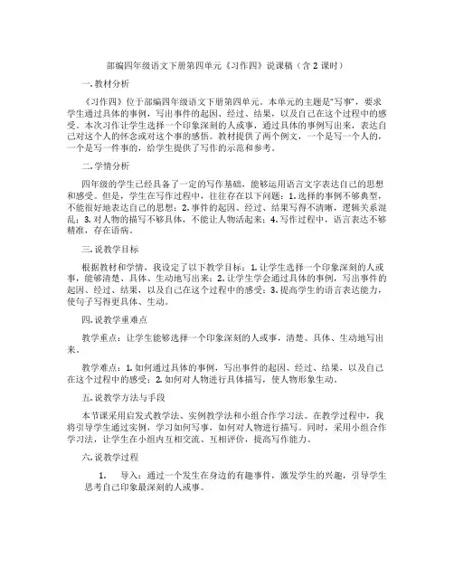 部编四年级语文下册第四单元《习作四》说课稿(含2课时)一. 教材分析《习作四》位于部编四年级语文下册第四单元。