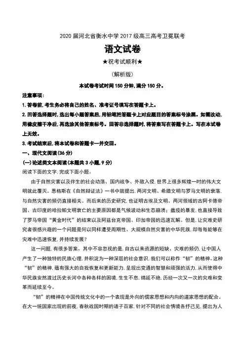 2020届河北省衡水中学2017级高三高考卫冕联考语文试卷★祝考试顺利★(解析版)本试卷考试时间150分钟,满分150分。
