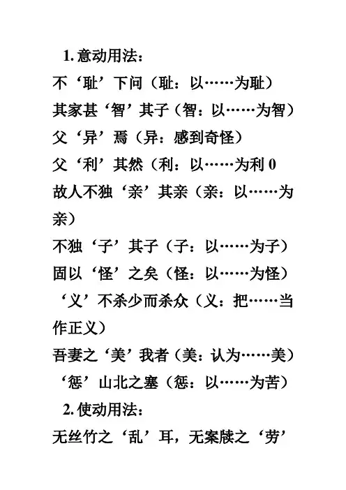 1.名词的意动用法名词用作意动,是把它后面的宾语所代表的人或事物看做这个名词所代表的人或事物。