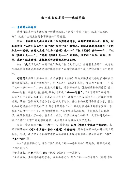 初中文言文复习——意动用法一、意动用法的特征意动用法属于词类活用的一种特殊现象。