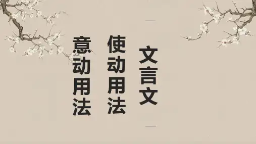 一、动词使动用法动词和它的宾语不是一般的支配与被支配的关系,而是使宾语所代表的人或事产生这个动词所表示的动作行为。