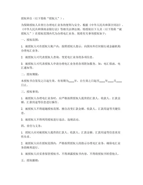 现将有关事项授权如下:一、授权范围:1. 被授权人可在授权人账户内,按照授权人指示,向国内外任何银行或金融机构办理电汇业务。