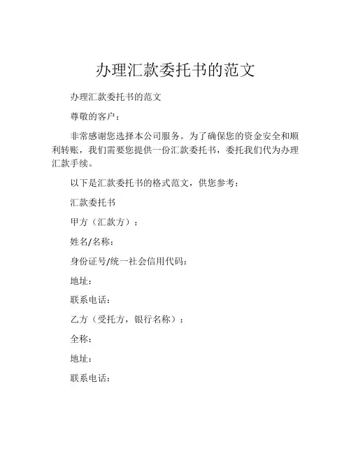 第2篇委托人:(姓名)身份证号码:(身份证号码)联系方式:(电话号码)受托人:(姓名)联系方式:(电话号码)鉴于委托人因工作、学习或其他原因,需要将一定金额的资金汇往以下指定账户,为确保资金安全及汇款顺利进行,特此委托受托人代为办理汇款事宜。