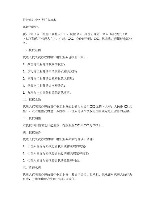 三、委托授权1. 受托人有权代表委托人向银行提交汇款申请,并签署相关文件。