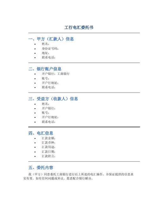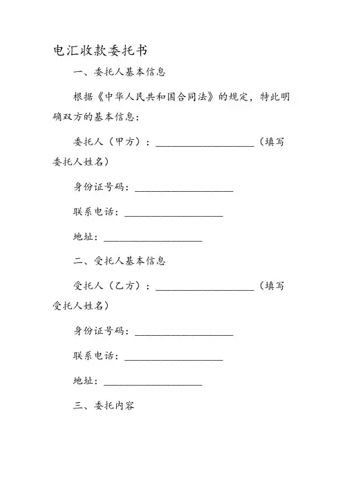 电汇收款委托书一、委托人基本信息根据《中华人民共和国合同法》的规定,特此明确双方的基本信息:委托人(甲方):___________________(填写委托人姓名)身份证号码:___________________联系电话:___________________地址:___________________二、受托人基本信息受托人(乙方):___________________(填写受托人姓名)身份证号码:___________________联系电话:___________________地址:___________________三、委托内容甲方特此委托乙方代为收取由甲方提供的电汇款项,具体如下:1. 甲方提供的电汇款项金额为___________________(大写)2. 电汇款项将于___________________(填写日期)汇入乙方指定的银行账户,账户信息如下:银行名称:___________________账号:___________________户名:___________________3. 甲方同意在电汇完成后,将款项汇入乙方指定的银行账户。