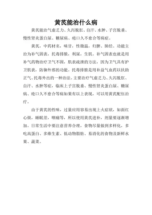 黄芪的功能主治除了上述常用的主治疾病外,黄芪还具有一些其他功能主治,列点如下:•提高机体抵抗力:黄芪可以增加机体的抵抗力,增强人体对外界环境的适应能力。