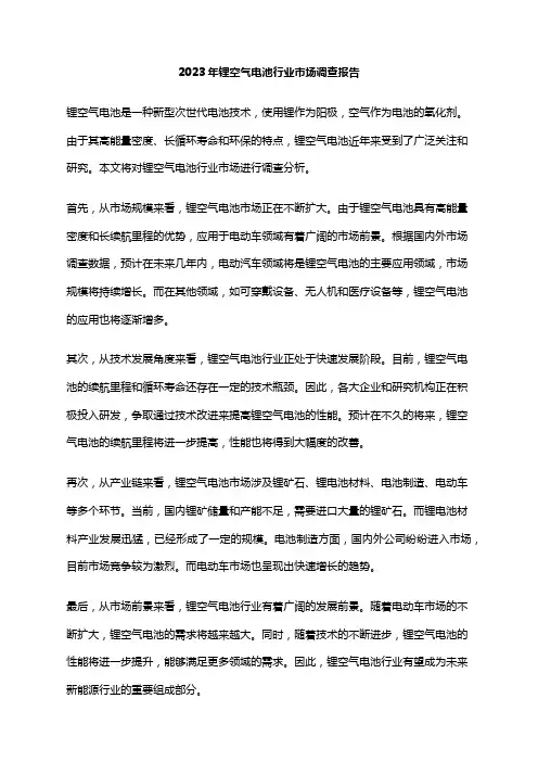2023年金属空气电池行业市场调研报告1. 市场概述金属空气电池是一种新型的电池,具有高能量密度、长寿命、环保等优点,在智能穿戴、无人机、智能家居等领域应用前景广阔。