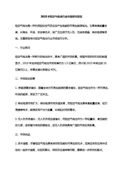2023年铝空气电池行业市场调查报告铝空气电池是一种新兴的电池技术,具有优异的能量密度和环保性。