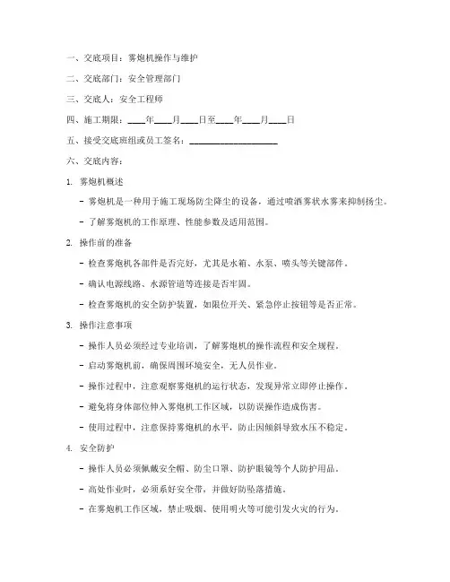 三、小型雾炮操作时的安全措施1. 操作人员应站在小型雾炮的安全区域进行操作,不得站在喷雾方向或范围内。