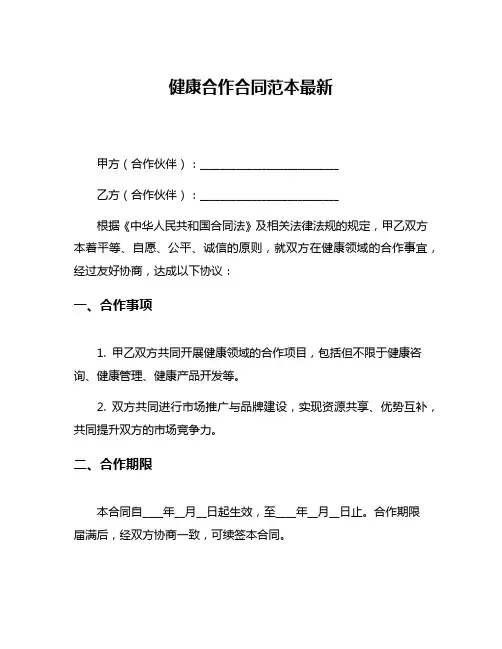 健康合作合同范本最新甲方(合作伙伴):___________________________乙方(合作伙伴):___________________________根据《中华人民共和国合同法》及相关法律法规的规定,甲乙双方本着平等、自愿、公平、诚信的原则,就双方在健康领域的合作事宜,经过友好协商,达成以下协议:一、合作事项1. 甲乙双方共同开展健康领域的合作项目,包括但不限于健康咨询、健康管理、健康产品开发等。