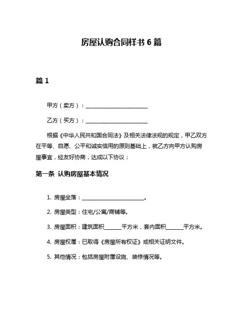 房屋认购合同样书6篇篇1甲方(卖方):_________________________乙方(买方):_________________________根据《中华人民共和国合同法》及相关法律法规的规定,甲乙双方在平等、自愿、公平和诚实信用的原则基础上,就乙方向甲方认购房屋事宜,经友好协商,达成以下协议:第一条认购房屋基本情况1. 房屋坐落:_________________________。