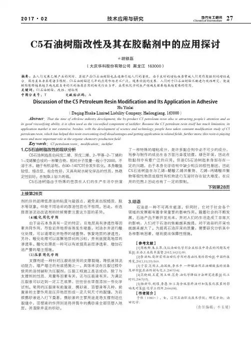 2 C5石油树脂的应用根据原料的不同C5石油树脂大致可分为以下几类:混合C5石油树脂,原料可采用经过初步分离或未经分离的混合C5馏分;脂肪族C5石油树脂,以浓缩间戊二烯为主要组分;双环戊二烯脂肪族C5石油树脂,以双环戊二烯(DCPD)为主要原料;共聚树脂,又分为C5 /C9共聚树脂,C5和其他物质的共聚树脂,双环戊二烯(DCPD)与其他物质的共聚树脂;加氢改性石油树脂。