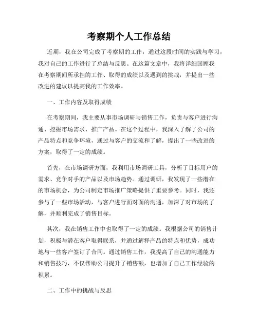 考察期工作总结一、背景介绍考察期是员工入职后的第一阶段,是公司对员工进行了解和评估的重要时期。