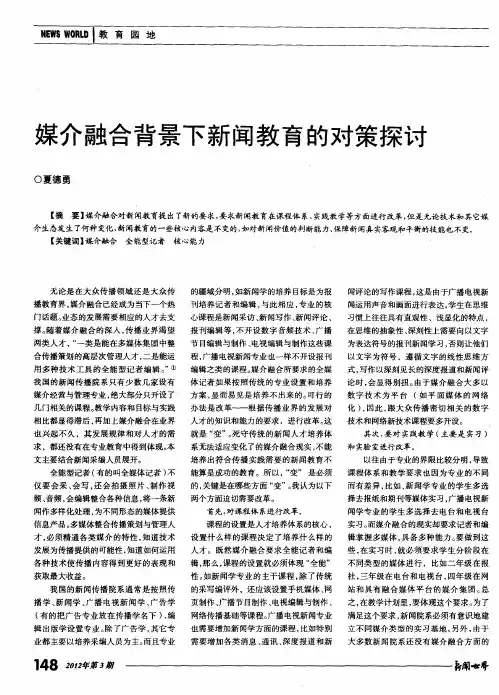 新闻视界媒介融合前景下的新闻传播变革与新闻教育改革吴昆(中北大学,山西,太原 036005)摘 要:随着社会经济不断的发展,我国也越发的重视新闻媒体的传播教育。