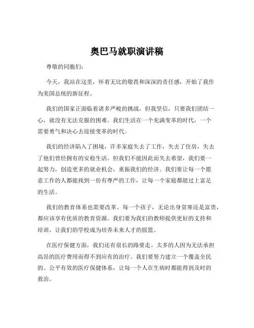 奥巴马就职演讲稿尊敬的各位观众、各位领导,女士们、先生们:大家好!今天,我非常荣幸站在这里,参加美国第44任总统就职典礼,并给大家带来我的就职演讲稿。