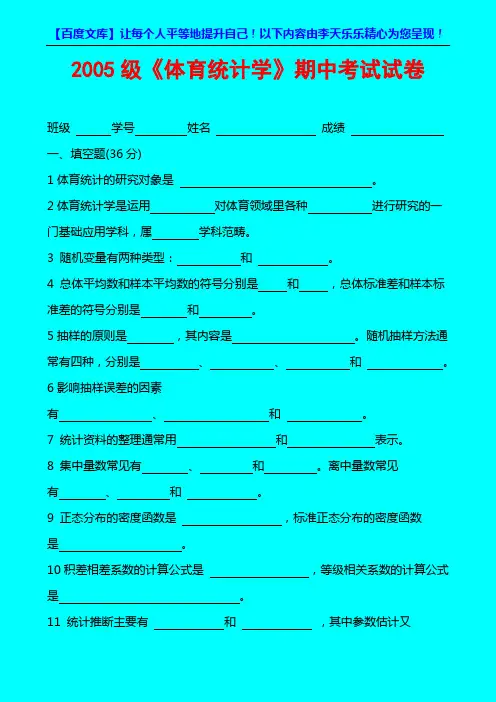 2005级《体育统计学》期中考试试卷班级学号姓名成绩一、填空题(36分)1体育统计的研究对象是。