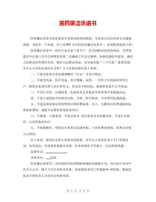 监督电话:______________承诺单位:___医院医药廉洁承诺书二为有效防治医药购销领域商业贿赂行为,纠正医疗活动中的不正之风,树立卫生行业阳光形象,促进我院各项工作健康和-谐发展。