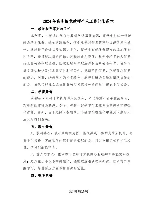 2024年信息技术教师个人工作计划范本一、教学指导原则与目标本学期,主要通过学习计算机网络基础知识,使学生对这一领域形成基本理解。