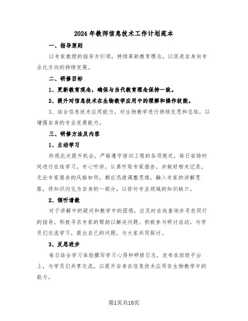 2024年教师信息技术工作计划范本一、指导原则以专家教授的指导为引领,持续革新教育理念,以促进自身向专业化方向的持续发展。