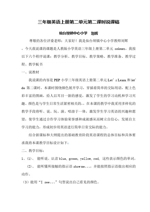 三年级英语上册第二单元第一课时说课稿第一部分说教材认知颜色,了解颜色,熟悉颜色,是孩子生活在这个社会中的一种本能、一种先天具有的好奇。