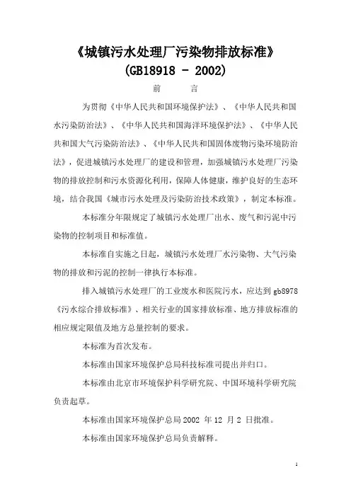 《城镇污水处理厂污染物排放标准》(GB18918 - 2002)前言为贯彻《中华人民共和国环境保护法》、《中华人民共和国水污染防治法》、《中华人民共和国海洋环境保护法》、《中华人民共和国大气污染防治法》、《中华人民共和国固体废物污染环境防治法》,促进城镇污水处理厂的建设和管理,加强城镇污水处理厂污染物的排放控制和污水资源化利用,保障人体健康,维护良好的生态环境,结合我国《城市污水处理及污染防治技术政策》,制定本标准。