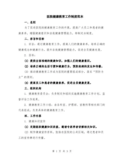 医院健康教育工作制度范本一、总则为了促进医院的健康教育工作的开展,提高广大员工和患者的健康素养,增强健康意识和自我健康管理能力,特制定本制度。