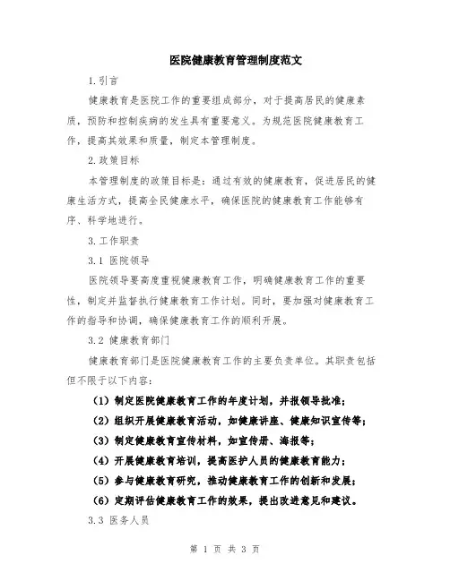 医院健康教育管理制度范文1.引言健康教育是医院工作的重要组成部分,对于提高居民的健康素质,预防和控制疾病的发生具有重要意义。