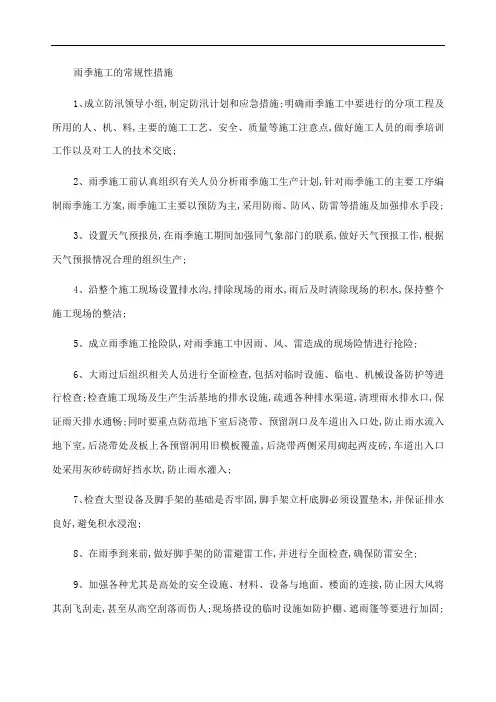 雨季施工的常规性措施1、成立防汛领导小组,制定防汛计划和应急措施;明确雨季施工中要进行的分项工程及所用的人、机、料,主要的施工工艺、安全、质量等施工注意点,做好施工人员的雨季培训工作以及对工人的技术交底;2、雨季施工前认真组织有关人员分析雨季施工生产计划,针对雨季施工的主要工序编制雨季施工方案,雨季施工主要以预防为主,采用防雨、防风、防雷等措施及加强排水手段;3、设置天气预报员,在雨季施工期间加强同气象部门的联系,做好天气预报工作,根据天气预报情况合理的组织生产;4、沿整个施工现场设置排水沟,排除现场的雨水,雨后及时清除现场的积水,保持整个施工现场的整洁;5、成立雨季施工抢险队,对雨季施工中因雨、风、雷造成的现场险情进行抢险;6、大雨过后组织相关人员进行全面检查,包括对临时设施、临电、机械设备防护等进行检查;检查施工现场及生产生活基地的排水设施,疏通各种排水渠道,清理雨水排水口,保证雨天排水通畅;同时要重点防范地下室后浇带、预留洞口及车道出入口处,防止雨水流入地下室,后浇带处及板上各预留洞用旧模板覆盖,后浇带两侧采用砌起两皮砖,车道出入口处采用灰砂砖砌好挡水坎,防止雨水灌入;7、检查大型设备及脚手架的基础是否牢固,脚手架立杆底脚必须设置垫木,并保证排水良好,避免积水浸泡;8、在雨季到来前,做好脚手架的防雷避雷工作,并进行全面检查,确保防雷安全;9、加强各种尤其是高处的安全设施、材料、设备与地面、楼面的连接,防止因大风将其刮飞刮走,甚至从高空刮落而伤人;现场搭设的临时设施如防护棚、遮雨篷等要进行加固;10、雨季期间对有顶盖的仓库或堆场要加强检查,进行加固,对没有遮挡的材料在下雨前要用塑料布或油毡进行覆盖并将边缘压严压实,做好排水工作;11、雨季施工所需材料,设备和其它用品,如水泵、抽水软管、塑料布等由材料部门提前准备齐全,并提前做好这些材料的检验工作和机械设备的检修;12做好生活区防汛措施,检修生活区宿舍,保证无漏雨显现,保证空气流通;针对雨季施工的专项措施1、施工测量1雨天不宜进行室外测量放线,雨后进行施工测量,轴线投放之前应先将工作面积水扫除干净,使投放的轴线清楚准确;2严禁雨中使用仪器,若必须在雨天且在室外操作时,应搭设防雨棚或有足够的挡雨措施;各种仪器用后进行要保养,保持其良好状态;3测量人员在钢构件上架设仪器设备时务必要对仪器进行防滑、防高空坠落措施,大风6级以上、大雨天气严禁测量作业;4采取测量点保护措施,物品遮盖或利用不易被雨水冲刷等明显材料标示或表示位置不在雨水冲刷部位;2、施工机械1塔吊、物料提升机等做好防雷装置,在雨季前对避雷装置进行全面检查,在雨季施工中定期检查,并应测量接地电阻,确保防雷安全;雷电停止后应检查避雷器的瓷瓶、连接线和地线是否完好无损;2露天使用的电气设备,如电焊机、切割机、电动葫芦等设备搭建好防雨篷,不得停放在低洼的地方,应停放在较高的坚实地面上;3小型施工机械、装修机械在雨天尽量放置于室内或防护棚内;4施工现场的各种配电箱、开关箱必须有防雨设施,并应装设端正、牢固,防止不被雨水浸泡;3、机电工程1做好施工场内的下水管道和雨水管井的检查,保证排水畅通,雨后不陷、不滑、不泥泞、不存水;2施工用机械设备需经常检查接零、接地保护,所有机械棚要搭设严密,防止漏雨,随时检查漏电装置是否灵敏有效;3对现场进场的批量材料,当楼内又无法及时放置的,做好防雨遮盖措施,尤其是电器设备和半成品;4在主体结构封顶后及雨季之前,做好各种预留孔洞的防雨水下落工作,避免雨量过大引起室内积水;高温季节施工措施一、保健措施1对高温作业人员进行作业前和入暑前的健康检查,凡检查不合格者,均不得在高温条件下作业;炎热时期应组织医务人员深入工地进行巡回和防治观察;2积极与气象部门联系,尽量避免在高温时段进行大工作量施工;3切实改善职工食堂、宿舍、办公室、厕所的环境卫生,定期喷洒杀虫剂,防止蚊、蝇孳生,杜绝常见病的流行;确保现场水电供应畅通,保证工人冲凉需求;4食堂制作易高温季节食用的饭食;5施工现场设置凉茶亭,并有专人负责供给,根据需要供给高温作业人员含盐饮料及防暑药品等;二、组织措施1教育职工不得擅自到海边洗澡、游泳,以免发生意外事故;2改善宿舍,职工生活条件,确保防暑降温物品及设备落到实处;3高温季节对在特殊环境下如露天、封闭等环境施工的人员,采取诸如遮阳、通风等措施或调整工作时间,早晚工作,中午休息,防止职工中暑、窒息等意外事故发生;4采用合理的劳动休息制度,可根据具体情况,在气温较高的条件下,适当调整作息时间,早晚工作,中午休息;三、技术措施1在高温天气施工的如抹灰工程,应适当增加其养护频率;2加强对易燃、易爆等危险品的贮存、运输和使用的管理,在露天堆放的危险品采取遮阳降温措施;严禁烈日曝晒,避免发生泄露,杜绝一切自燃、火灾、爆炸事故;3室内装修作业面通风良好;湿作业完毕后,用塑料布覆盖或及时养护,以免水分蒸发过快造成装修面损坏;4高温天气,加工现场使用电气焊及其他机具时,要防止火星溅落引起火灾,消防设备必须齐全、有效;5对于钢结构焊接这一关系到整体安装质量的特殊工序,必