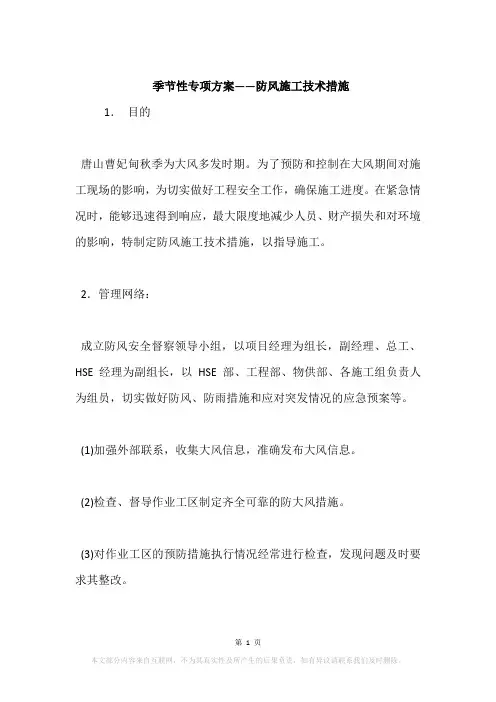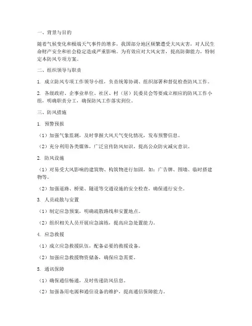 二、组织领导与职责1. 成立防风专项工作领导小组,负责统筹协调、组织部署和督促检查防风工作。