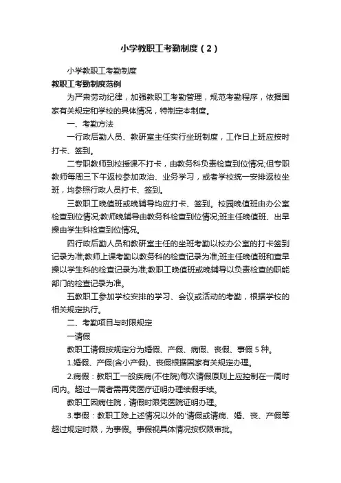 小学教职工考勤制度第一条总则为了加强学校内部管理,规范教职工的考勤工作,保证教育教学工作的正常进行,根据国家及地方教育行政部门的相关规定,结合我校实际,制定本考勤制度。