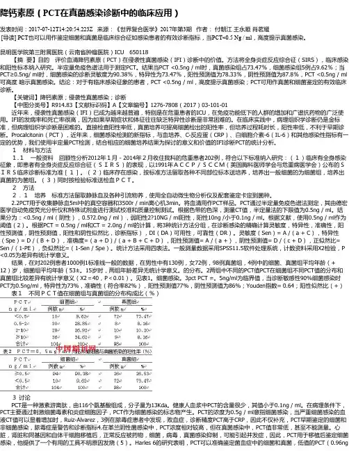 降钙素原(PCT在真菌感染诊断中的临床应用)发表时间:2017-07-12T14:20:54.223Z 来源:《世界复合医学》2017年第3期作者:付朝江王永顺肖茗耀[导读] PCT也可以用作鉴定细菌和真菌是临床综合征如感染患者的有效诊断指标,当PCT<0.5 Ng / ml,高度提示真菌感染。