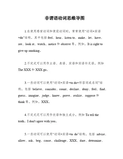 非谓语动词思维导图1.在使用感官动词和使役动词时,常常使用“动词+宾语+do”结构,其中包括feel、hear、listen to、make、let、have、see、look at、watch、notice和observe等。