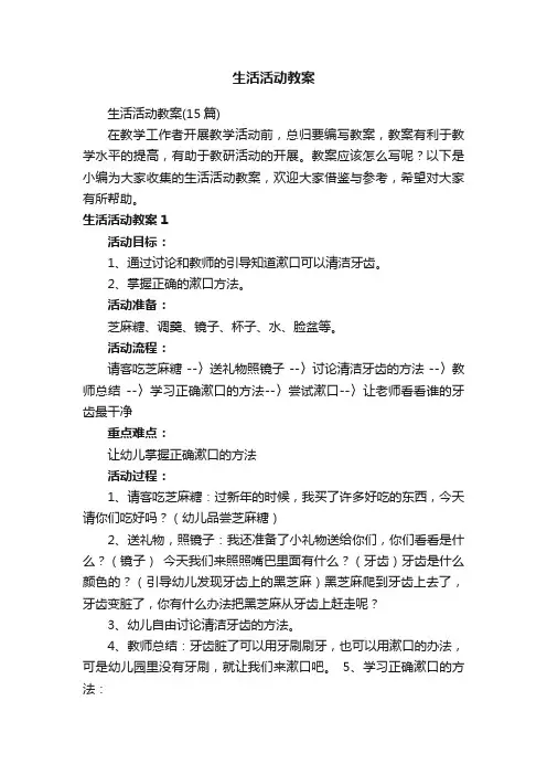 文档下载后可定制修改,请根据实际需要进行调整和使用,谢谢!并且,本店铺为大家提供各种类型的经典范文,如幼儿教案、小学教案、中学教案、教学活动、评语、寄语、发言稿、工作计划、工作总结、心得体会、其他范文等等,想了解不同范文格式和写法,敬请关注!Download tips: This document is carefully compiled by this editor.I hope that after you download it, it can help you solve practical problems. The document can be customized and modified after downloading, please adjust and use it according to actual needs, thank you!In addition, this shop provides you with various types of classic sample essays, such as preschool lesson plans, elementary school lesson plans, middle school lesson plans, teaching activities, comments, messages, speech drafts, work plans, work summary, experience, and other sample essays, etc. I want to know Please pay attention to the different format and writing styles of sample essays!幼儿园生活活动教案40篇这是幼儿园生活活动教案40篇,是优秀的幼儿园教案文章,供老师家长们参考学习。