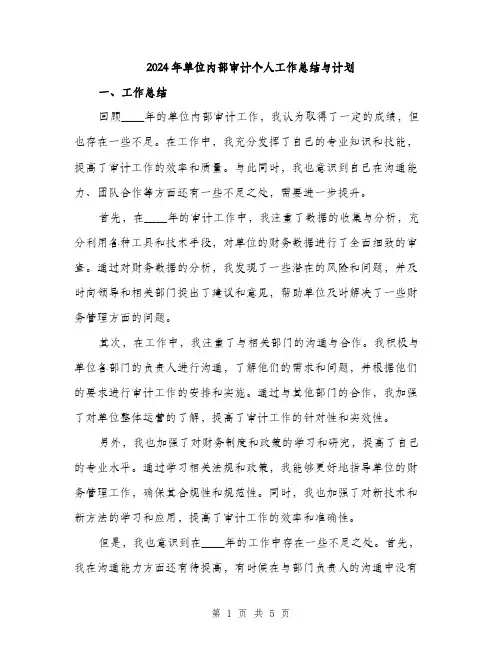 2024年单位内部审计个人工作总结与计划一、工作总结回顾____年的单位内部审计工作,我认为取得了一定的成绩,但也存在一些不足。