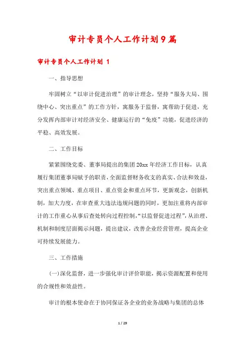 审计专员个人工作计划9篇审计专员个人工作计划 1一、指导思想牢固树立“以审计促进治理”的审计理念,坚持“服务大局、围绕中心、突出重点”的工作方针,寓服务于监督,寓帮助于促进,充分发挥内部审计对经济安全、健康运行的“免疫”功能,促进经济的平稳、高效发展。
