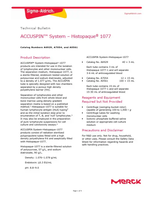Technical BulletinACCUSPIN™ System – Histopaque ® 1077Catalog Numbers A6929, A7054, and A0561Product DescriptionACCUSPIN System-Histopaque -1077products are intended for use in the isolation of lymphocytes and other mononuclear cells. The separation medium, Histopaque-1077, is a sterile-filtered, endotoxin tested solution of polysucrose and sodium diatrizoate, adjusted to a density of 1.077 g/mL. The ACCUSPIN tube is specially designed with two chambers separated by a porous high density polyethylene barrier (frit).Separation of lymphocytes and other mononuclear cells from whole blood and bone marrow using density gradientseparation media is based on a published method.1 Histopaque-1077 is suitable for human lymphocyte antigen (HLA) typing 2 and as the initial isolation step prior toenumeration of T, B, and ‘null’ lymphocytes.3 It may also be employed in the preparation of pure lymphocyte suspensions for cell culture and cytotoxicity assays.4ACCUSPIN System-Histopaque-1077 products consist of radiation sterilized polypropylene tubes fitted with a highdensity polyethylene frit and aseptically filled with Histopaque-1077.Histopaque-1077 is a sterile-filtered solution of polysucrose, 57 g/L, and sodium diatrizoate, 90 g/L.Density: 1.076–1.078 g/mL Endotoxin: 0.3 EU/mL pH: 8.8–9.0ACCUSPIN System-Histopaque-1077Catalog No. A692940 × 3 mLEach tube contains 3 mL ofHistopaque 1077-1 and will separate 3-6 mL of anticoagulated blood Catalog No. A7054 12 × 15 mLCatalog No. A0561100 × 15 mLEach tube contains 15 mL ofHistopaque 1077-1 and will separate 15-30 mL of anticoagulated bloodReagents and Equipment Required but Not ProvidedCentrifuge (swinging bucket rotor)capable of generating 100 to 1,000 g Centrifuge tubes for washing mononuclear cellsIsotonic phosphate buffered saline solution or appropriate cell culture mediumPrecautions and DisclaimerFor R&D use only. Not for drug, household, or other uses. Please consult the Safety Data Sheet for information regarding hazards and safe handling practices.Preparation InstructionsSpecimen Collection - Collect blood in preservative-free anticoagulant (EDTA or heparin) or use defibrinated blood. For best results, blood should be processed within 2 hours.On occasion, it may be necessary to dilute the blood sample 3 to 5-fold, depending on absolute cell numbers. A similar volume of prediluted blood may be used or the blood sample may be diluted directly in upper chamber of the ACCUSPIN tube (seeProcedure, step 3). This is appropriate for specimens with hematocrits above normal.Storage/StabilityStore the products at 2–8 C.Histopaque-1077 has an expiration period of 3 years. Reagent label bears expiration date.ProcedureAnticoagulated blood can be added to the top chamber of the tube without risk of mixing with the Histopaque-1077 in the lowerchamber under the frit. On centrifugation the whole blood migrates through the frit to contact with the Histopaque-1077. The elements of greater density displace a volume of Histopaque-1077 above the frit giving a clear separation of the bloodcomponents. The erythrocytes aggregate and the granulocytes become slightly hypertonic, increasing their sedimentation rate, resulting in pelleting at the bottom of the ACCUSPIN Tube. Lymphocytes and other mononuclear cells, e.g., monocytes, remain at the plasma/Histopaque-1077 interface. This dense band of mononuclear cells may be collected by pouring off the contents of the upper chamber or by means of a pipette. Erythrocyte contamination is avoided due to the barrier between the chambers.Most extraneous platelets are removed by low speed centrifugation during the washing steps.1. Bring desired number of tubes to roomtemperature. If Histopaque-1077 isabove the frit prior to use, centrifuge at 1,000 g for 30 seconds at room temperature.Note: Failure to bring ACCUSPIN System-Histopaque-1077 to room temperature may cause limited recovery of mononuclear cells. 2. Label tube(s).3. Freely pour the blood sample into theupper chamber of each ACCUSPIN System-Histopaque-1077 tube.a. Use 3–6 mL of whole blood withACCUSPIN System-Histopaque-1077 tubes, Catalog No. A6929. b. Use 15–30 mL of whole blood withACCUSPIN System-Histopaque-1077 tubes, Catalog Nos. A7054 or A0561. Note: Use of volumes of prediluted or whole blood other than those recommended may result in decreased recovery.4. Centrifuge at 1,000 g for 10 minutes atroom temperature or centrifuge at 800 g for 15 minutes at roomtemperature. Centrifugation at lower temperatures, such as 4 C, may result in cell clumping and poor recovery.Note: If platelet contamination is a concern, add the mononuclear cells to a 4-20% sucrose gradient that has been layered over Histopaque-1077.Centrifuge at 1,000 × g for 10 minutes at room temperature. The platelets will pellet at the bottom, while themononuclear cells will migrate to the Histopaque-1077 layer.5. After centrifugation, carefully aspiratethe plasma layer with a Pasteur pipette to within 0.5 cm of the opaque interface containing mononuclear cells. Properly dispose of the plasma layer.Note: Failure to remove the excesssupernatant may result in contamination of the mononuclear band with plasma proteins.6. Carefully transfer the opaque interfacewith a Pasteur pipette into a clean conical centrifuge tube.Note: Removal of Histopaque-1077 with the mononuclear band increasesgranulocyte contamination from residual granulocytes, which may remain at the mononuclear interface.7. Wash the cells by adding 10 mL ofisotonic phosphate buffered saline solution or appropriate cell culture medium and mix by gently drawing in and out of a Pasteur pipette. 8. Centrifuge at 250 g for 10 minutes. 9. Aspirate the supernatant and discard. 10. Resuspend cell pellet with 5 mL ofisotonic phosphate buffered saline solution or appropriate cell culture medium and mix by gently drawing in and out of a Pasteur pipette.11. Centrifuge at 250 g for 10 minutes. 12. Repeat steps 9, 10, and 11, discardsuperna