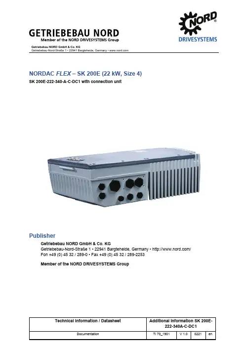 Getriebebau NORD GmbH & Co. KGGetriebebau-Nord-Straße 1 • 22941 Bargteheide, Germany • NORDAC FLEX – SK 200E (22 kW, Size 4)SK 200E-222-340-A-C-DC1 with connection unitPublisherGetriebebau NORD GmbH & Co. KGGetriebebau-Nord-Straße 1 • 22941 Bargteheide, Germany • / Fon +49 (0) 45 32 / 289-0 • Fax +49 (0) 45 32 / 289-2253Member of the NORD DRIVESYSTEMS GroupDocumentation – Additional Information SK 200E-222-340A-C-DC1 2 / 7TI 70_1901 - 0221Validity of documentThe following information applies for the following types of NORDAC FLEX series frequency inverters. • Frequency inverterSK 200E-222-340-A-C-DC1 (part number: 275137817)• Connection unitSK TI4-4-2xx-4-C-DC1 (part number: 275279914)Destruction of the frequency inverter through use of an incorrect connection unitIf the frequency inverter is not operated with the corresponding connection unit, this will result in overload of electrical components and thus to the destruction of the device.• Only operate the frequency inverter with the corresponding connection unit.The devices differ from standard devices basically in the permissible supply voltage and the connection terminals to be used for this purpose. The devices are based on the standard firmware of the NORDAC PRO SK 200E series.• The frequency inverter is to be used exclusively with the corresponding connection unit.• The connection unit is to be used exclusively with the corresponding frequency inverter.The following documents are therefore the basis for the device:1. BU 0200, edition 4920 (Part no.: 6072001)Safety information, hardware description, installation notes and software description for the basic device2. BU 0210, edition 1620 (Part no.: 6072101)Description of the POSICON function3. BU 0550, edition 1919 (Part no.: 6075501)for the description of PLC functionality4. and the following information identifying the differences of the device in comparison with BU 0200with regard to the hardware description and installation information.Documentation – Additional Information SK 200E-222-340A-C-DC1TI 70_1901 - 02213 / 71 GeneralThe following deviations from the manual apply.Chapter 1.6 Standards and approvalsThere is no approval according to UL, CSA, RCM or EAC as well as CE EX or EAC Ex !2 Assembly and installationThe following deviations from the manual apply.Chapter 2.3 Braking resistor (BR) Chapter removed.No braking resistor can be connected.Chapter 2.4.2 Electrical connection of the power unit Paragraph3. Mains cable connection: to terminals L1-L2/N-L3 and PE (depending on the device)is replaced by3. Mains cable connection: to terminals DC+ / DC- and PEDocumentation – Additional Information SK 200E-222-340A-C-DC14 / 7TI 70_1901 - 0221Chapter 2.4.2.1 Mains connection (L1, L2(/N), L3, PE) This chapter is replaced byChapter 2.4.2.1 Mains connection (DC+, DC-, PE)WARNINGElectric shockDangerous voltages can be present at the mains input and the motor connection terminals, even when the device is not in operation.• Before starting work, check that all relevant components (voltage source, connection cables, connection terminals of the device) are free of voltage using suitable measuring equipment. • Use insulated tools (e.g. screwdrivers). • DEVICES MUST BE EARTHED.Supply voltage connectionIncorrect DC supply connection results in destruction of the frequency inverter. • Observe correct polarityFuse protection must be provided by a suitable DC fuse (see technical data). For connection to or isolation from the mains, components (main switch or contactor) with suitable DC rating must be used. Isolation from or connection to the mains must always be carried out for all poles.InformationInput chokeFor improved EMC characteristics and in order to minimise the back-flowing current, an input choke can be incorporated into the mains supply cables. • Inductance: 0.3 to 0.5 mH • Nominal current: ≥ 50 AJumper positionThe jumpers for the line filters (2) must be set according to the figure (only jumpers on the right are set).CY = ONDocumentation – Additional Information SK 200E-222-340A-C-DC1TI 70_1901 - 02215 / 7Connection schemeChapter 2.4.2.3 Brake resistor (+B, -B) Chapter removed.3 Display, operation and optionsNo deviations4 CommissioningNo deviations5 ParametersNo deviations6 Operating status messagesNo deviationsDocumentation – Additional Information SK 200E-222-340A-C-DC1 6 / 7TI 70_1901 - 02217 Technical DataThe following deviations from the manual apply.Chapter 7.1 General dataFunction SpecificationPulse frequency 3.0 … 16.0 kHz, factory setting = 6 kHzPower reduction > 6 kHzAmbient conditions 3K4 IP66Hardware status EAAFirmware status V2.2 R0All other specifications remain unchanged.Chapter 7.2.2 Electrical data 400 V2) FLA – Full Load Current, maximum current for the entire mains voltage range as stated above3) FLA (S1-40°C)4) Fan cooling, temperature controlled ON= 55°C, OFF= 50°C,Run-on time if the 50°C limit is undershot and with the removal of the enable: 2 minutesDocumentation – Additional Information SK 200E-222-340A-C-DC1TI 70_1901 - 02217 / 78 Additional informationThe following deviations from the manual apply.Chapter 8.3.3 EMC of the deviceFigure 33, The wiring recommendation is to be applied analogously. • Mains connection: Instead of L1, L2/N, L3, now use DC+, DC- according to the labelling on the terminal strip • Braking resistor n/aChapter 8.4.4 Reduced output current due to low voltage Chapter removed.Chapter 8.5 Operation on the RCD Chapter removed.9 Maintenance and service informationNo deviations。