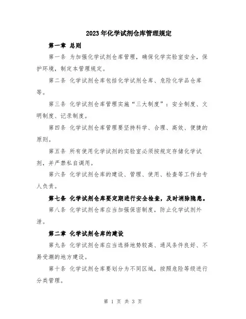 2023年化学试剂仓库管理规定第一章总则第一条为加强化学试剂仓库管理,确保化学实验室安全,保护环境,制定本管理规定。