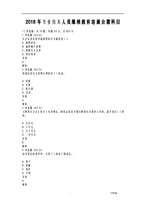 2018年专业技术人员继续教育培训公需科目1)单选题,共10题,每题3.0分,共30.0分1 单选题(3.0分)安全信息系统中最重要的安全隐患是()。