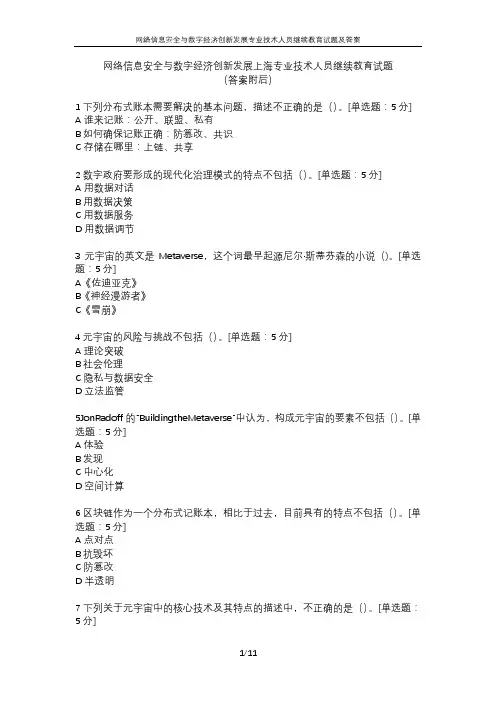 网络信息安全与数字经济创新发展上海专业技术人员继续教育试题(答案附后)1下列分布式账本需要解决的基本问题,描述不正确的是()。