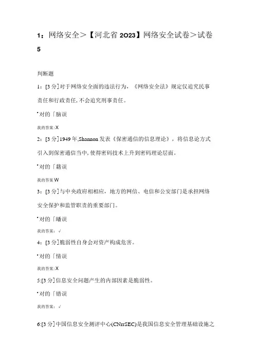1:网络安全>【河北省2O23】网络安全试卷>试卷5判断题1:[3分]对于网络安全面的违法行为,《网络安全法》规定仅追究民事责任和行政责任,不会追究刑事责任。