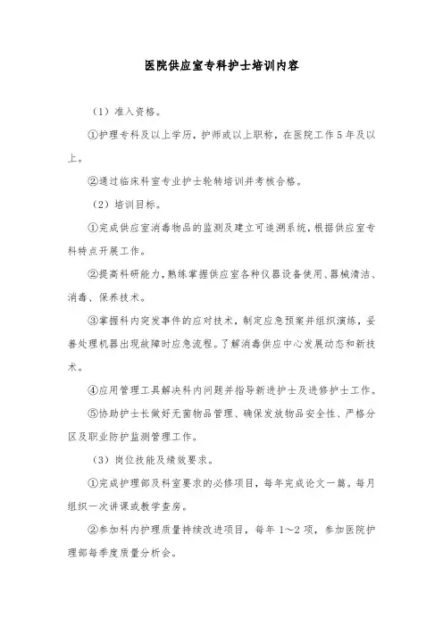 供应室护士培养计划第一篇:供应室护士培养计划供应室护士培养计划为提高供应室工作质量,提高业务素质,强化全体护士对专业知识的掌握及熟练应用程度,我们做出如下护理培训计划:培训目标:一、能够熟练掌握科室专业知识,熟练应用和强化技术技能,处理疑难差错事故,应对突发事件。