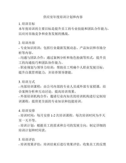 2024年供应室培训计划范本一、培训目标:1. 提升供应室工作人员的专业技能和综合素质;2. 加强团队合作意识,提高工作效率;3. 提高供应室员工的沟通能力和客户服务水平。