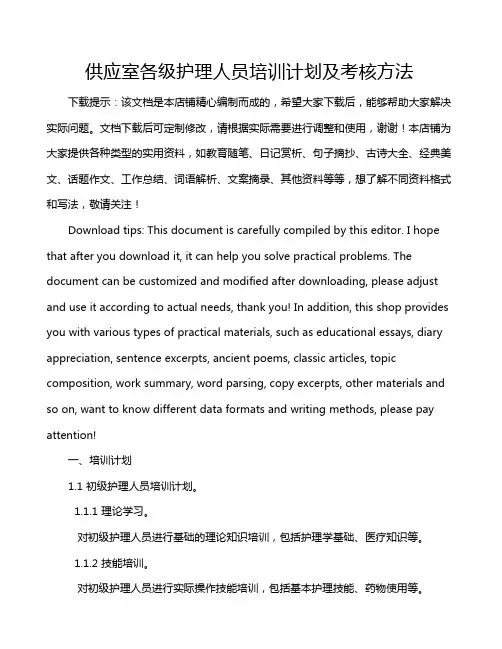 供应室各级护理人员培训计划及考核方法下载提示:该文档是本店铺精心编制而成的,希望大家下载后,能够帮助大家解决实际问题。