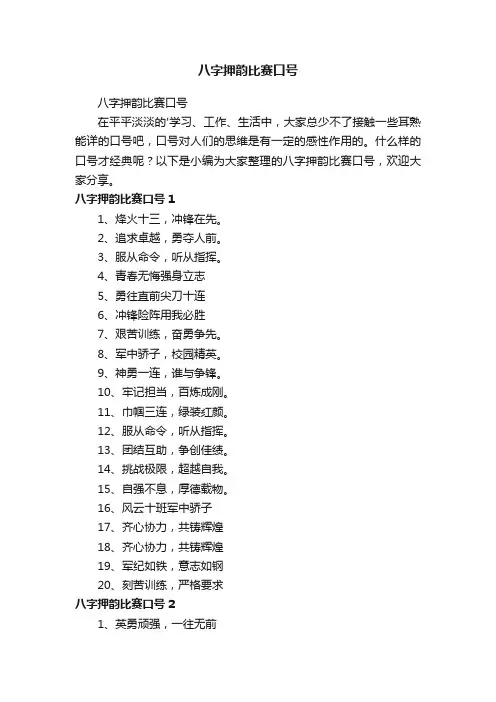 3、大三大三,永摘桂冠!4、大三大三,雄霸一方5、加油加油!你们最棒!6、全家总动员,小朋友我最棒!7、顽强拼搏、超越极限8、挥动激情、放飞梦想9、青春无悔、激情无限10、顽强拼搏、勇夺第一11、遵规守纪、团结互敬12、拼搏奋进、永远进步13、奥运精神、永驻我心14、强身健体、立志成材15、健康美丽,永远最棒!8字霸气押韵口号篇51.我自信我出色,我努力我成功。
